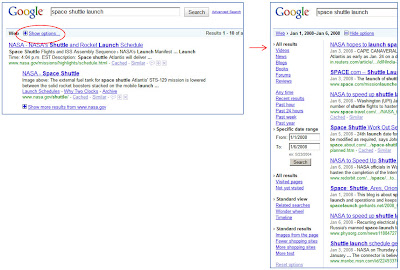 Today, we're announcing nine new Search Options tools: past hour, specific date range, more shopping sites, fewer shopping sites, visited pages, not yet visited, books, blogs and news. These features have been rolling out gradually and will be available globally in English by the end of the day. You can try them yourself by searching Google and clicking "Show options" in the blue bar just under the logo.